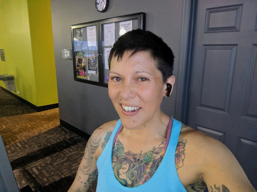 When this guy first came up to me I was in the middle of resistance band pull-throughs, an exercise I always feel like I’m doing wrong. He stood not far from me and just stared. When I finished my last rep I pulled out my earbud and said, “Hi,” with a WTF look on my face. Then he launched into his compliment. Pretty sure I was blushing while I told him, “Thank you.”