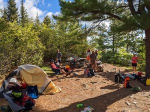 Because of the wind we started scouting campsites fairly early. But not all campsites are created equal. First, we needed five level-ish spots for all our tents. Then we needed a semi-decent place for the canoes for the evening.