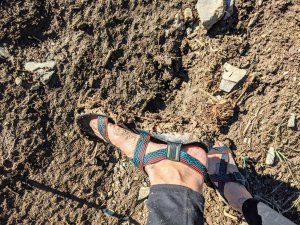 Remember how we got a big snow around here early in the week? Well, it was mostly melted, and that made the trail muddy as hell. We slipped and slid through the mud almost the entire way to the hot spring. Mud caked our footwear. And we were all getting sore and tired from trying to keep our balance as we walked.