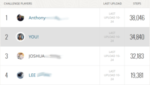 There’s a rolling seven-day step challenge that is always going on. That means it adds up everyone’s steps for the last seven days and ranks us. I’m usually #1. Every once in a while someone will create a legit challenge where you steps are counted for a certain period of time.
