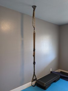 Part of my productivity yesterday was adding to my workout room. My friend came over and helped me locate the ceiling stud (aka joist, but I like saying stud) to mount my TRX anchor on. Now I can finally use my TRX strap! I even found a YouTube channel with a bunch of TRX workouts so I don’t have pay for the TRX subscription.