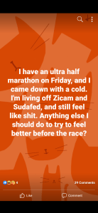 I recently joined a Facebook (Meta?) group, Bad ultrarunning advice. It’s the most amazing thing I’ve ever discovered on Facebook. They call any distance an ultra, typically only give bad advice, and make fun of themselves. Since I’m not feeling well and have my racing in a few days, I turned to them for help.