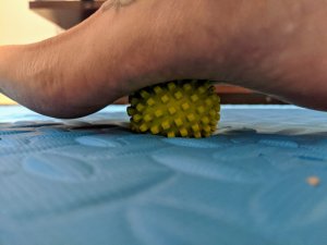 Between my chiro and what I’ve read so far in the book, I went to the sporting goods store and bought some new toys to help me in my journey to pain-free running. I still need to find a box, like one to jump on, step on, and put my foot on for Bulgarian squats. But I’m on my way!