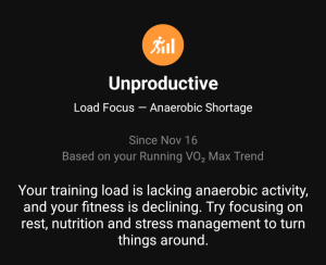 So, for the past couple of days Garmin has told me my training status is unproductive because I’m not doing enough aerobic activity and I’m too focused on anaerobic activity. Today my run was entirely aerobic, and guess what Garmin had to say about that?