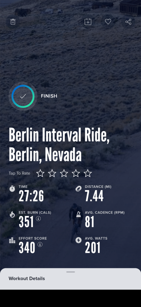 To keep from pushing myself too hard this week, I opted for a slightly shorter ride today. I also left the resistance where the ride put it instead of increasing it to make the harder. I kept my heart rate less than 130 bpm, but it still felt like I got a decent workout in.