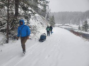 Last year, we skied and snowshoed into the cabin because there was a ton of snow. It was also February. This year, by the time we looked at reserving the cabin, this was only weekend available. There wasn’t much snow, so we decided to drive most of the way to the cabin. We walked the last quarter mile down the steep-ish hill just to be safe.