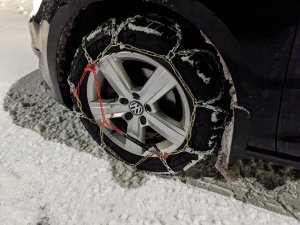 Even though the warning said not to go over 30 mph with the chains on, I averaged 40 mph. After about an hour there was barely any snow on the ground. The rattling and vibration of the chains started driving me crazy, so I pulled over and took them off.
