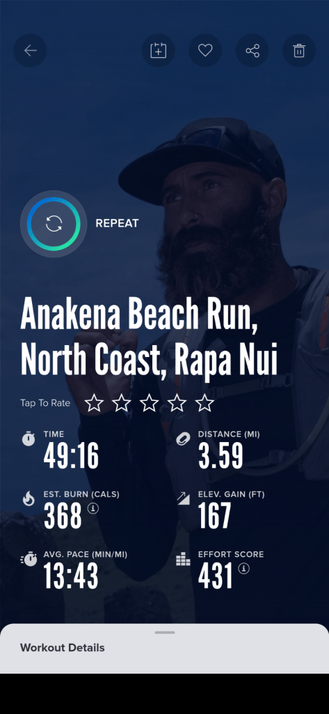 I finally pulled myself together and settled on the iFit run I had scheduled for Thursday. Beautiful Rapu Nui (Easter Island) and the fun facts about it bestowed upon me by Tommy Rivs helped pull me out of my bad mood. I even managed to enjoy most of the run!