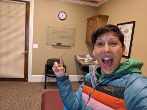 When I went into the private patient room to wait for my PT doc, they had a nice welcome message on the board for me. It’s the little things make a patient feel special. My appointment was with the same guy I did my gait analysis with. I assumed he remembered or wrote down what he discovered during my gait analysis even though we didn’t specifically talk about what we discussed the last time I saw him. He did say we were going to work on preventative stuff for my running and my hip.