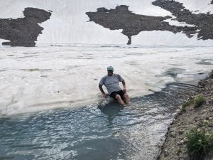 Again, we took our sweet time making it to our next home for the night. We stopped at Mirror Lake for lunch and swim, and took another break at Sunset Lake to enjoy the views. Then it was up, up, up to Hurricane Pass. From the pass we could see Schoolroom Glacier and the little glacial lake below it. We detoured to the lake because we wanted to see how cold it was, and man, was it cold!