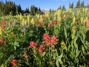 None of us were in a hurry to get to camp, so we took our time. We hiked at a leisurely pace and took plenty of breaks to soak in the beauty around us. Because of the wet spring season, the wildflowers were spectacular! Our planned campsite wasn’t near a water source, so we stopped and had dinner at a lake about two miles from camp. The water was cold, and most of us hopped in to rinse off the sweat from our hard day of over 4,000 feet of climbing.