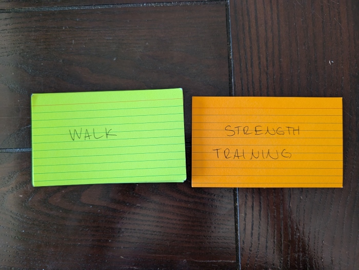 Yellow cards are my normal to-do items. Orange cards are things I would like to do, but if they don’t get done, no additional stress is created. I also added green cards in the stack as rewards because my brain loves rewards. My rewards are also designed to help my mental health. For example, writing this blog is a reward, but it is also a journal, which means getting my thoughts on “paper” and out of my head.